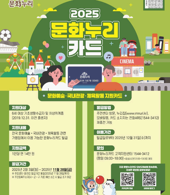 * 2024년 문화누리카드 발급 후 사용내력이 있으며, 2025년에도 수급자격을 유지할 경우, 별도의 신청절차 없이 자동으로 2025년 지원금(14만 원)을 문화누리카드에 충전됩니다.