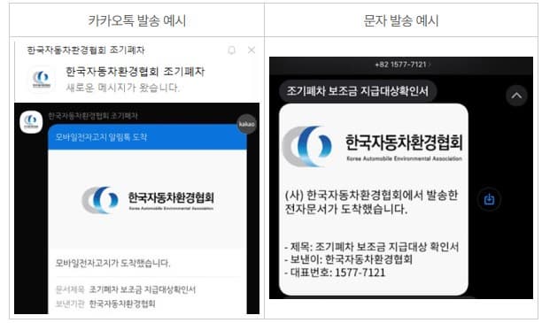 한국자동차환경협회에서 신청서 검토 후 차주에게 "보조금 지급대상 확인서"를 모바일 전자고지(카카오, 문자)등으로 10일 이내에 알려줍니다.(단, 조기폐차 물량이 급증할 경우, 확인서 통보 기간이 연장될 수 있습니다.)