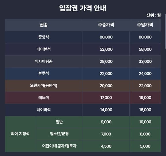 - 문화가 있는 날 : 매월 수요일 외야석 50% 할인